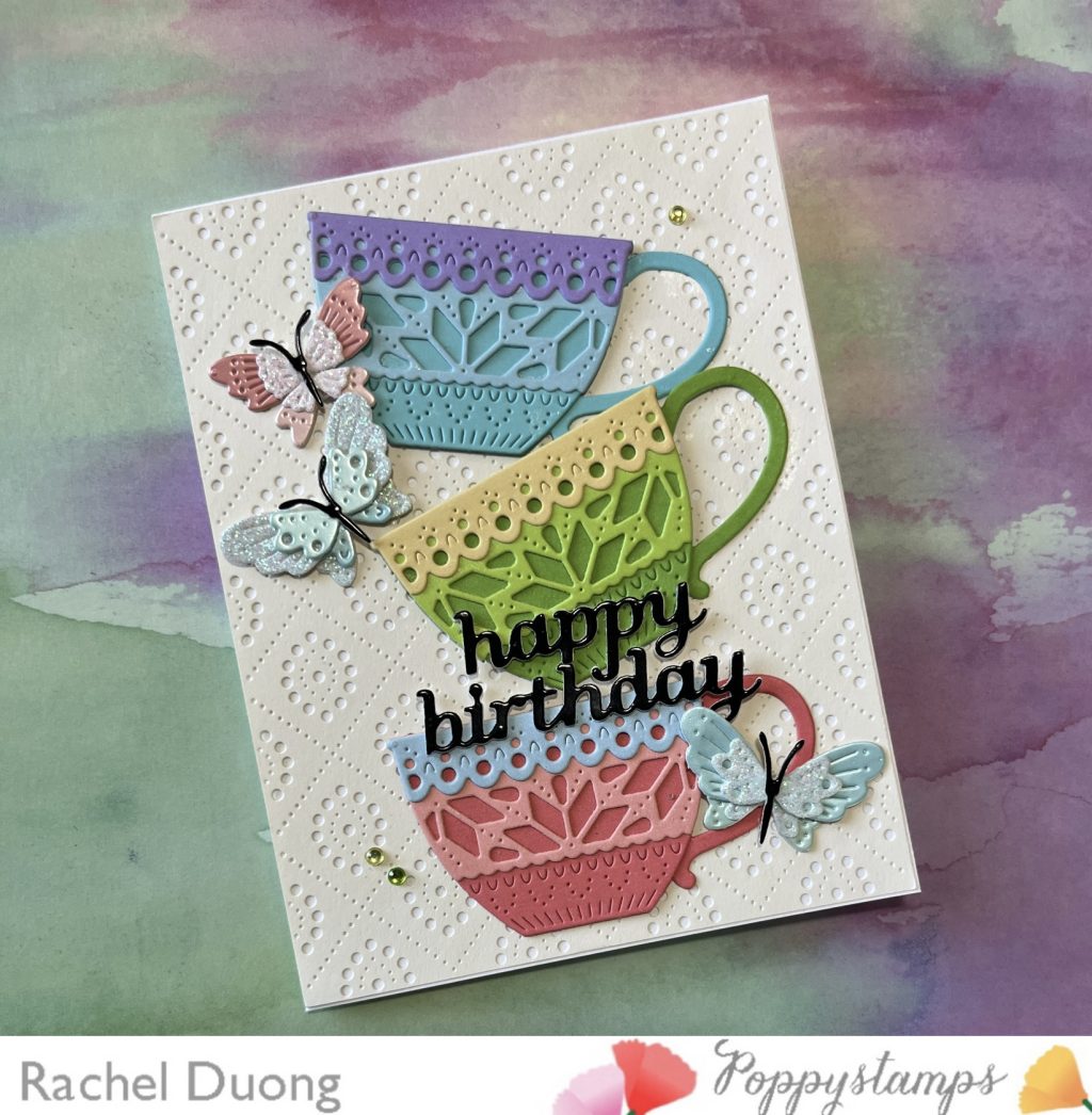 Hi friends, it’s Rachel here with a “chirpful” thank you card. I love this bird and the flowers from the latest Poppystamps Nordic Dream release. My favorite is the Nordic Petalglow Flower (on the right). The delicate, intricate details are amazing! The soft blue, yellow and warm green hues on this card make me happy!